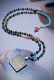 Điểm nhấn đặc biệt là miếng trầm khắc Lục Tự Đại Minh Chân Ngôn "Om Mani Padme Hum" (Án Ma Ni Bát Dĩ Hồng) – thần chú linh thiêng của Phật giáo, biểu trưng cho sự thanh lọc tâm trí – khai mở trí tuệ – mang lại bình an & may mắn cho người sở hữu.